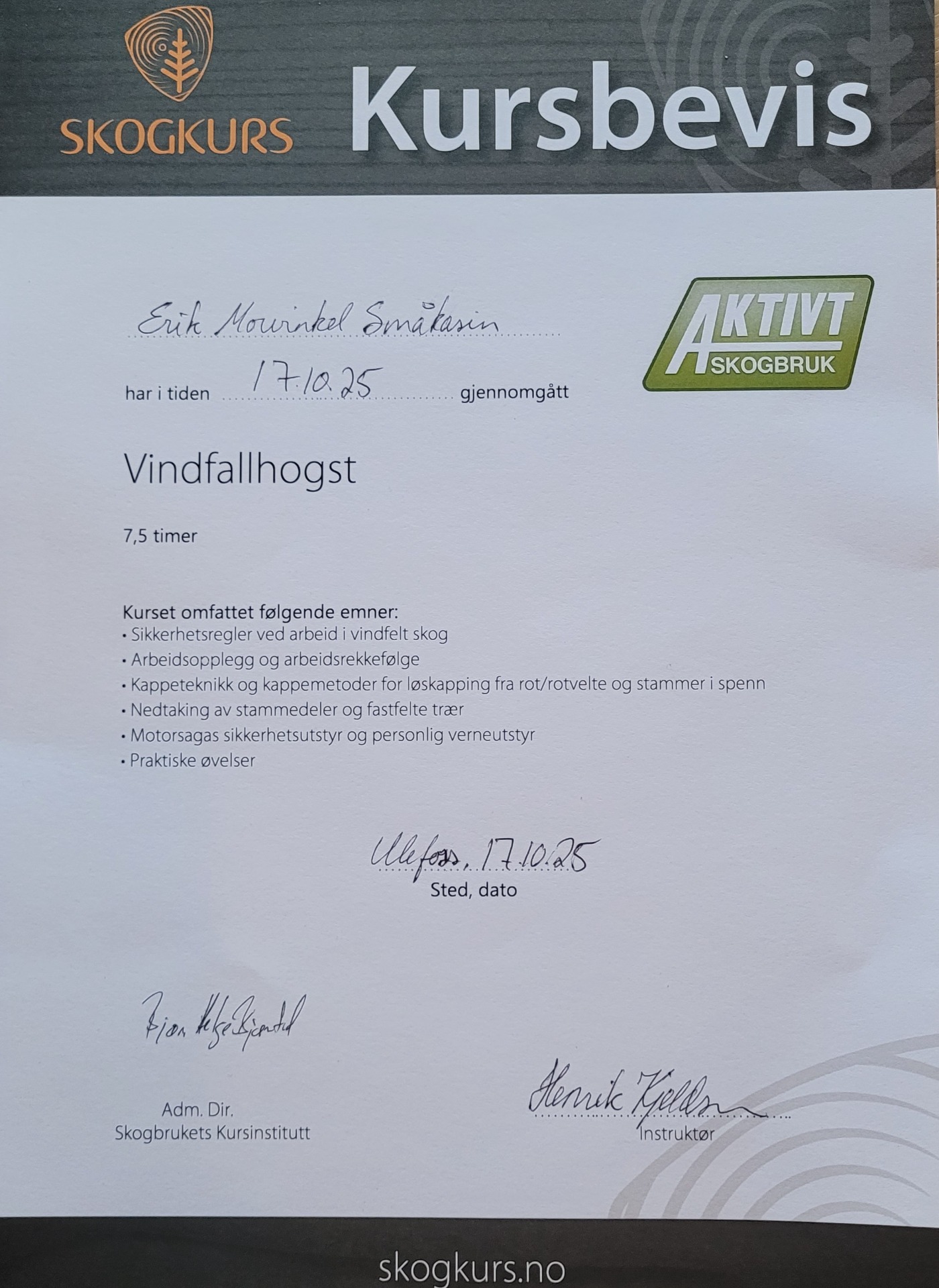 Vi er sertifisert innen: treklatring, bruk av motorsag, ryddesag for profesjonelle og PEFC skogstandard (oppdatert 2024) som innebærer standard for bærekraftig skogbruk. Medlem Norsk trepleieforum med stadige faglige oppdateringer for en best mulig standard på alle våre trepleie jobber.